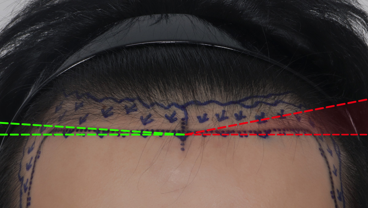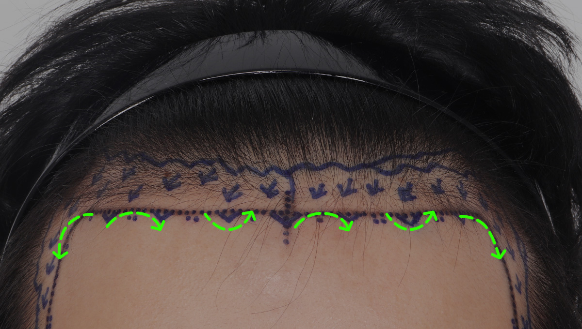 2가지 MIX WAVE 디자인인위적인 대칭은 비호감입니다. 이마라인을 선으로 그은 듯 이식하는 것은 최악입니다. 좌우 대칭을 맞춰가며 라인을 물결모양으로 불규칙하게 만드는 것이 좋은데, 물결도 볼록한(convex) 형태나 오목한(concave), 한 가지가 아니라 두 형태를 불규칙하게 섞어 주는 것이 좋습니다.