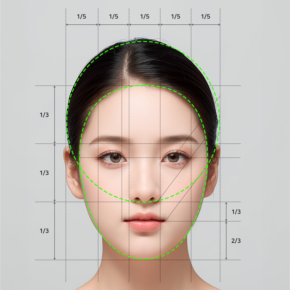 세로의 황금비율 1:1:1:1:1얼굴을 세로로 나누는 것 역시 매우 중요한데, 사진과 같이 5개 영역으로 나누게 됩니다. 이 5개의 길이가 동일하다면 황금비율입니다. 맥스웰에서는 눈동자의 위치, 눈이 끝나는 위치, 눈과 관자놀이와의 거리 등을 고려하여 디자인합니다.