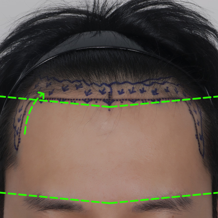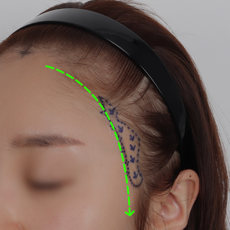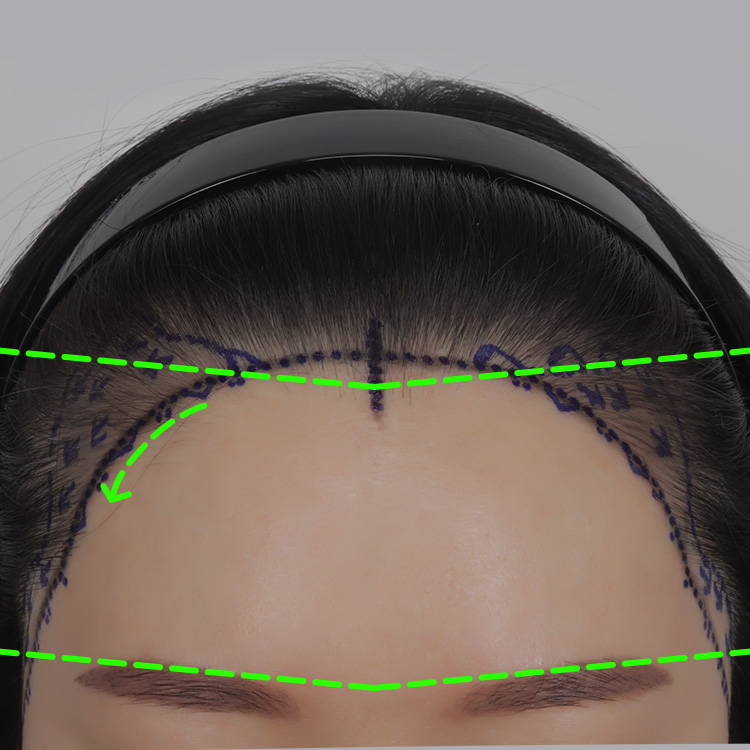 남성은 눈썹과 평행, 여성은 눈썹 밑눈썹 라인과 헤어 라인을 평행하게 선을 그엇을 때 헤어라인이 눈썹 라인 보다 아래로 내려가는 디자인은 여성스럽고 부드러운 느낌이 되고, 위로 갈수록 남성적이면서 시원한 느낌을 줍니다.