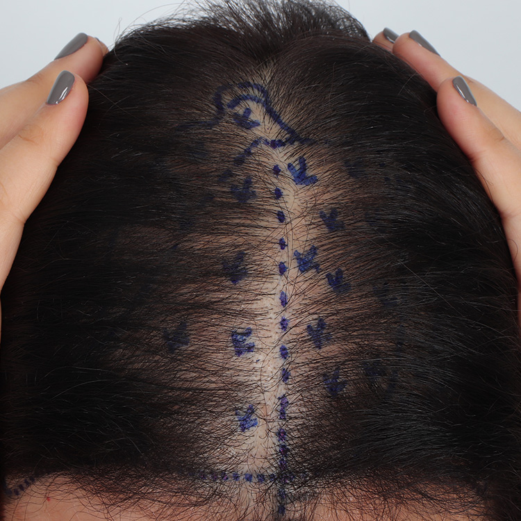 정수리 부분은 풍성함을 극대화하는 것이 관건입니다. 얇아진 모발 사이사이에 이식을 하는 것이므로 기존 모발이 다치지 않게 섬세하게 이식을 하는 것도 중요합니다. 가장 중요한 것은 ‘얇아진 모발을 두껍게 할 수 있으냐'에 대한 판단입니다. 시각적으로는 개수보다 두께가 더 중요하기 때문입니다.